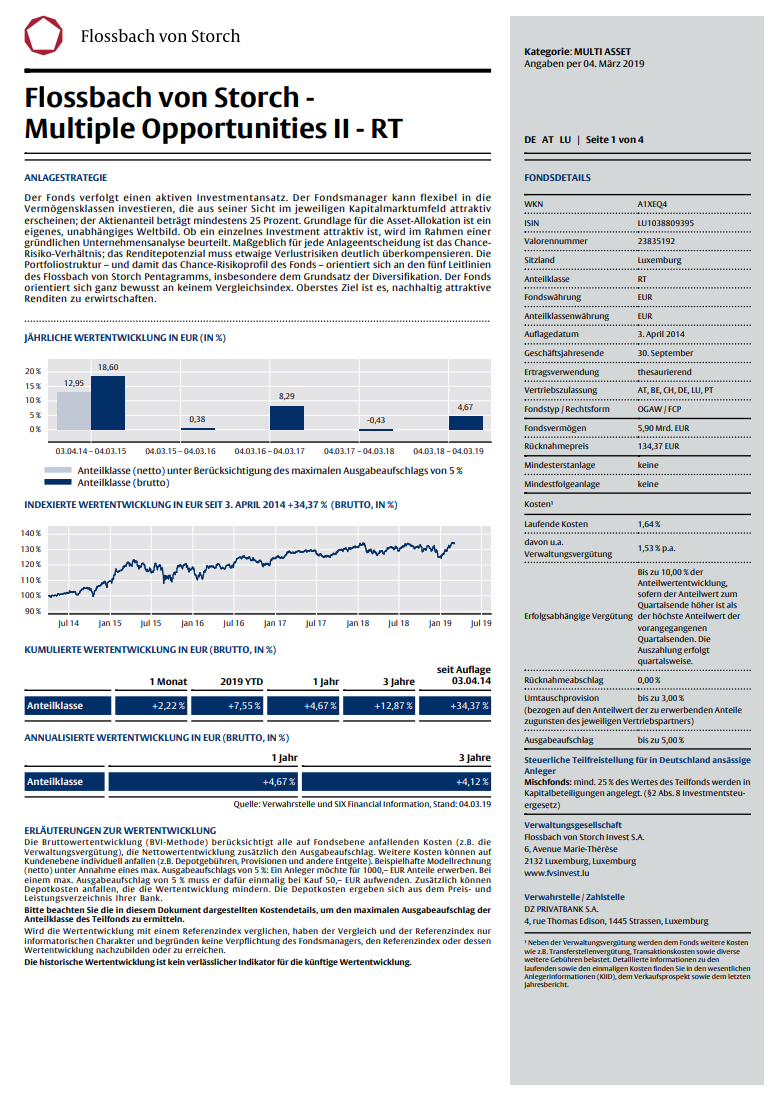 Die Flossbach von Storch Invest S.A. wurde 2012 als Aktiengesellschaft nach Luxemburger Recht gegründet. Sie verwaltet Publikums- und Spezialfonds. Das Fondsmanagement für die verwalteten Publikumsfonds nimmt die Muttergesellschaft, die Flossbach von Storch AG, in Köln wahr. Die Flossbach von Storch AG wurde 1998 von Bert Flossbach und Kurt von Storch gegründet. Heute ist das Unternehmen einer der größten bankenunabhängigen Vermögensverwalter in Deutschland – und nach wie vor im Eigentum seiner Gründer und leitenden Angestellten. Flossbach von Storch steht für einen Multi-Asset-Ansatz – er ist Teil der Unternehmens-DNA: Vermögen erhalten und mehren, in dem man es auf verschiedene Anlageklassen aufteilt. Die Anlagephilosophie folgt fünf großen Leitlinien: Diversifikation, Flexibilität, Qualität, Solvenz und Wert. Diese fünf Grundsätze, grafisch dargestellt im Flossbach von Storch-Pentagramm, finden sich in allen Fonds und Mandaten wieder. Das Weltbild, unabhängig und frei von der Einflussnahme Dritter, bildet das Fundament der Anlagestrategie; eine Strategie, die aktiv ist, kaufmännisch geprägt und verschiedene Anlageklassen berücksichtigt. Die Chancen eines Investments müssen stets deutlich größer sein als dessen Risiken.